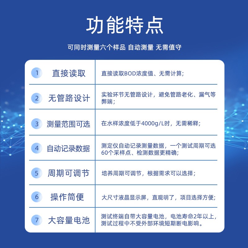 批量處理 | 6份水樣/次 | 測量周期 | 1天~30天 |