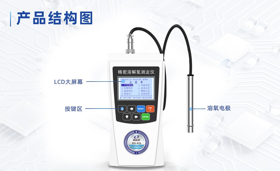 DO-810型便攜式溶氧儀采用超低功耗單片機測量和控制,采用熒光法測量。具有穩(wěn)定可靠、操作簡單方便等優(yōu)點;該儀器能以兩種溶解氧含量表示單位指示測定結果,即氧濃度(mg/L)和氧的飽和百分含量(%),此外還同時對被測介質的溫度(℃)進行測量顯示。